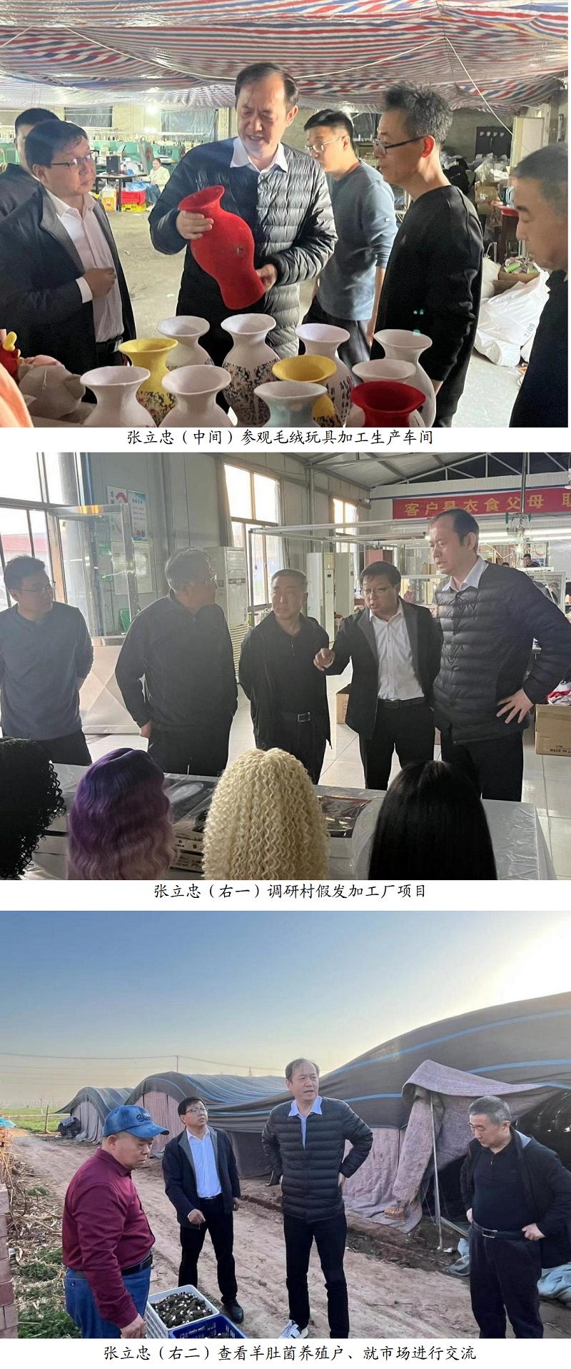 調(diào)研工作由曲周縣大河道鄉(xiāng)黨委書記王貴民陪同,參觀了毛絨玩具、假發(fā)加工車間和羊肚菌種植基地。會(huì)議中介紹了賈莊村當(dāng)前發(fā)展?fàn)顩r、存在問(wèn)題以及未來(lái)發(fā)展規(guī)劃。下沉工作隊(duì)隊(duì)長(zhǎng)齊連洪匯報(bào)了工作隊(duì)近期走訪調(diào)研及項(xiàng)目謀劃的工作進(jìn)展和下一步工作打算。