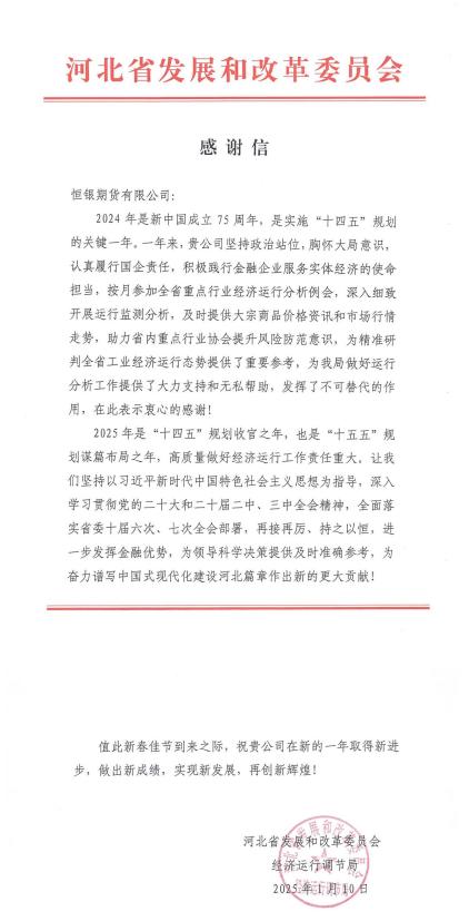 近日,河北省發(fā)展和改革委員會(huì)經(jīng)濟(jì)運(yùn)行調(diào)節(jié)局向恒銀期貨發(fā)來(lái)感謝信。信中對(duì)恒銀期貨踐行國(guó)有金融企業(yè)服務(wù)實(shí)體經(jīng)濟(jì)的使命擔(dān)當(dāng)、深入細(xì)致開展運(yùn)行監(jiān)測(cè)分析、及時(shí)提供大宗商品價(jià)格資訊和市場(chǎng)行情走勢(shì)、助力省內(nèi)重點(diǎn)行業(yè)協(xié)會(huì)提升風(fēng)險(xiǎn)防范意識(shí)、協(xié)助研判全省工業(yè)經(jīng)濟(jì)運(yùn)行態(tài)勢(shì)等工作表示感謝,并對(duì)恒銀期貨2025年工作提出了期望和要求。