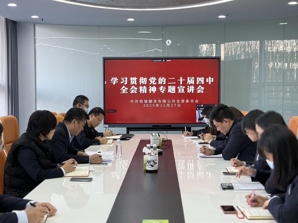 2025年11月27日,恒銀期貨有限公司在總部會議室設立主會場,召開學習貫徹黨的二十屆四中全會精神宣講報告會。河北國富投資副總經理、恒銀公司黨支部書記、董事長李剛作專題宣講,公司全體黨員和積極分子現(xiàn)場參會,公司外地黨員及從業(yè)人員通過線上會議同步學習。