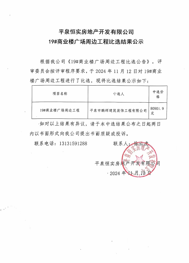 平泉恒實公司19#商業(yè)樓廣場周邊工程比選結(jié)果公示