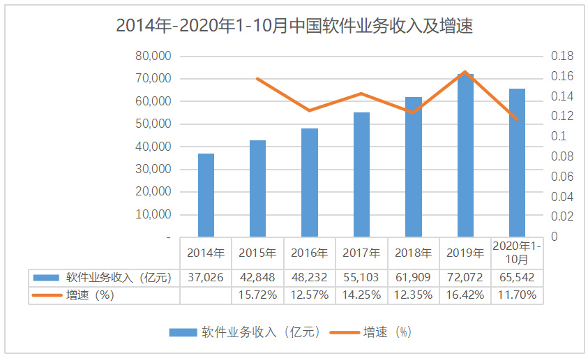 近年來(lái),我國(guó)軟件和信息技術(shù)服務(wù)產(chǎn)業(yè)規(guī)模迅速擴(kuò)大,技術(shù)水平顯著提升,已發(fā)展成為戰(zhàn)略新興產(chǎn)業(yè)的重要組成部份。2020年1-10月中國(guó)軟件業(yè)務(wù)收入為65,542億元,同比增長(zhǎng)11.7%。