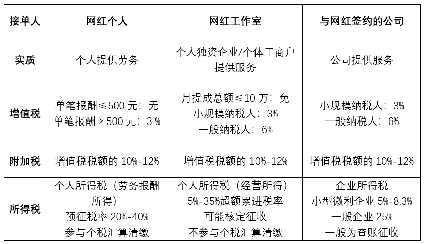 與直播網(wǎng)紅(主播)或?qū)谧髡吆灱s的公司為商家提供服務(wù)的,涉及以下稅種。